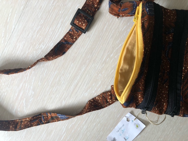 Pochette bandoulière en tissus de récupération: coton fantaisie en extérieur et coton couleur moutarde uni à l’intérieur. Deux poches latérales sont fermées par des fermetures-éclairs. La hauteur de la sangle est réglable grâce à une boucle plastique noire.