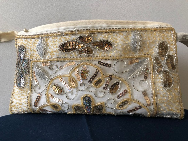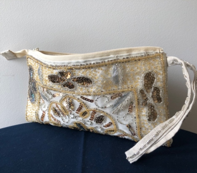 Pochette de soirée en tissu d’ameublement brodé. L’anse latérale a été réalisée en lin écru et brodée à la main en petites perles grises, avec fermeture éclair.