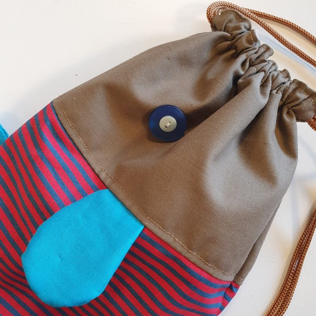 Sac de rangement en forme de poisson, fait de tissus, boutons et cordons recyclés.