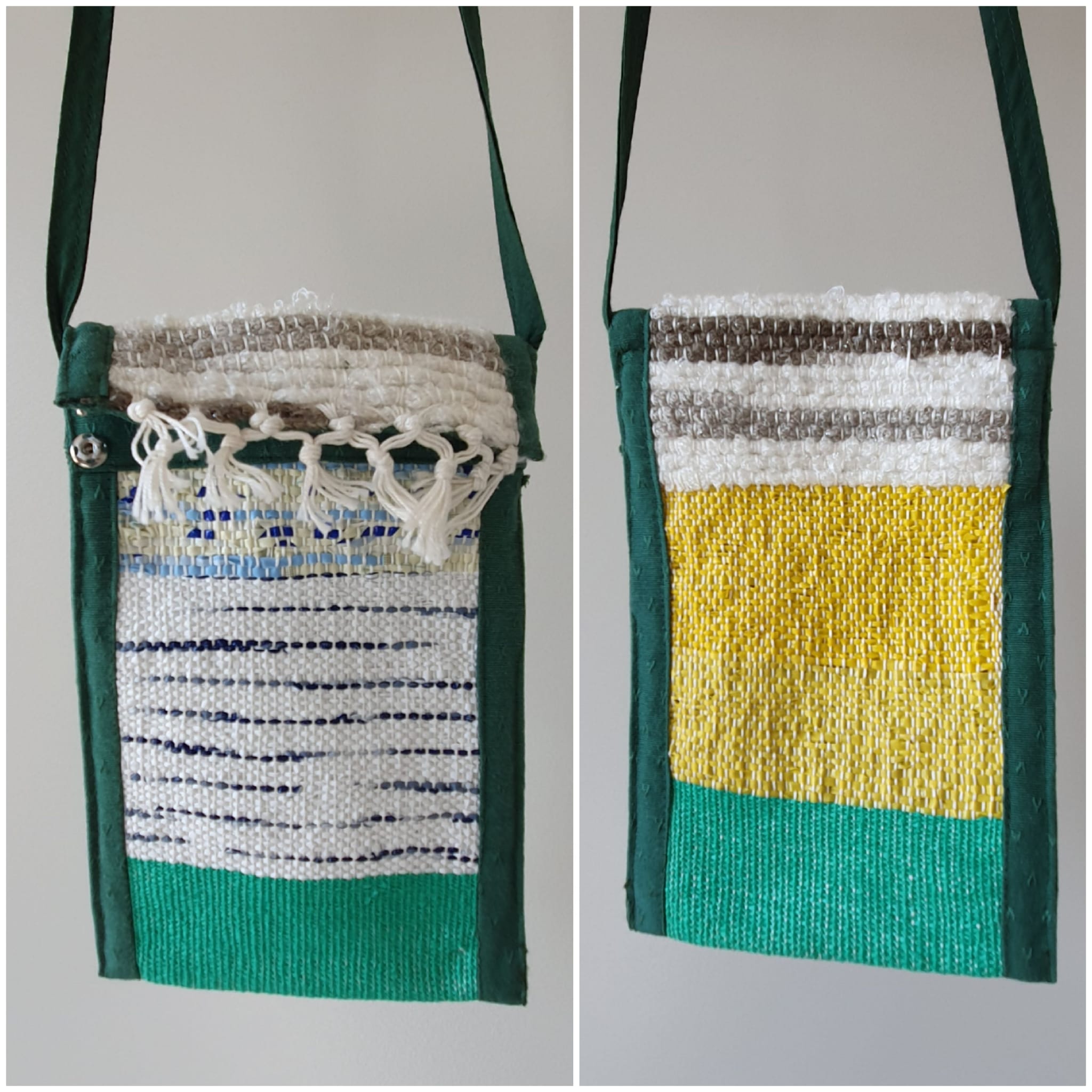Porte-téléphone tissé en plastiques découpés en toutes fines lanières et en laines récupérées. Fermé par 2 boutons-pression. L’intérieur et la bordure latérale est en coton uni vert brodé, tandis que la bandoulière est en coton vert uni.