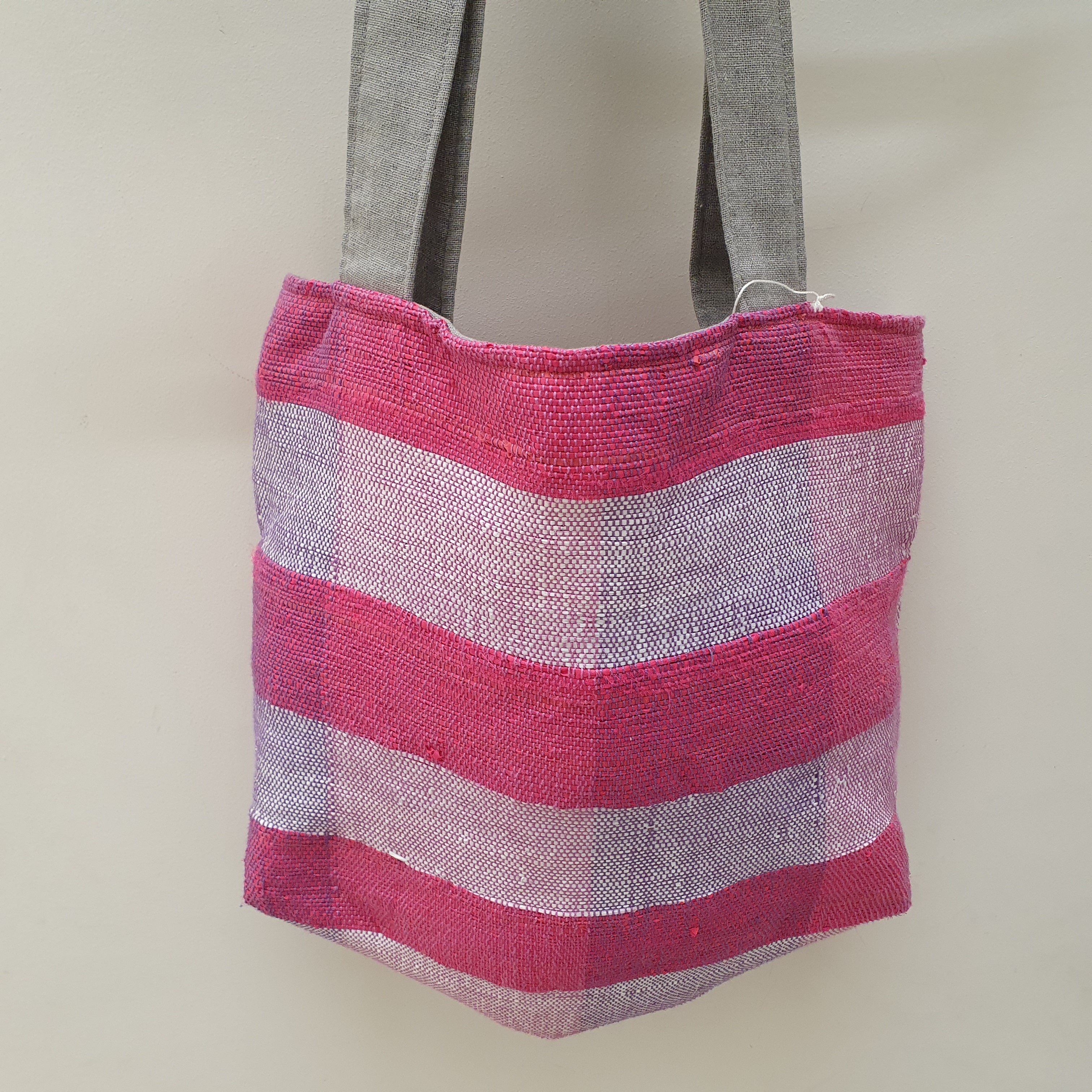 Sac tissé entièrement à la main en sacs plastiques découpés et matières textiles de récupération découpées en toutes fines lanières et tissées main. Intérieur et lanières en tissu uni gris et poche interne.